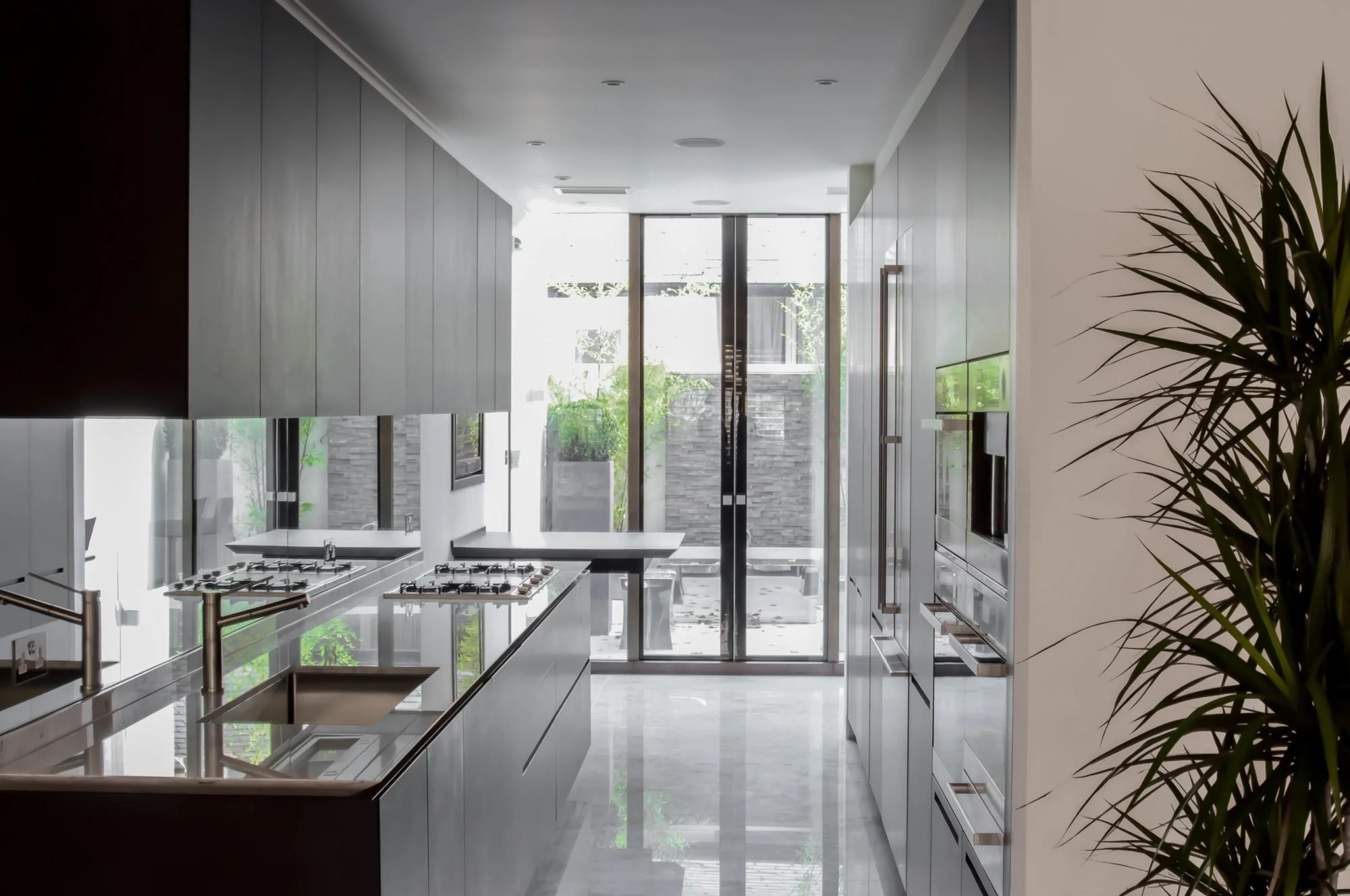 A new double-height glazed extension was added to the rear of the property, creating a dramatic and light-filled space that connects the interior with the garden. The extension opens onto a new terrace, providing a seamless transition between indoor and outdoor living.