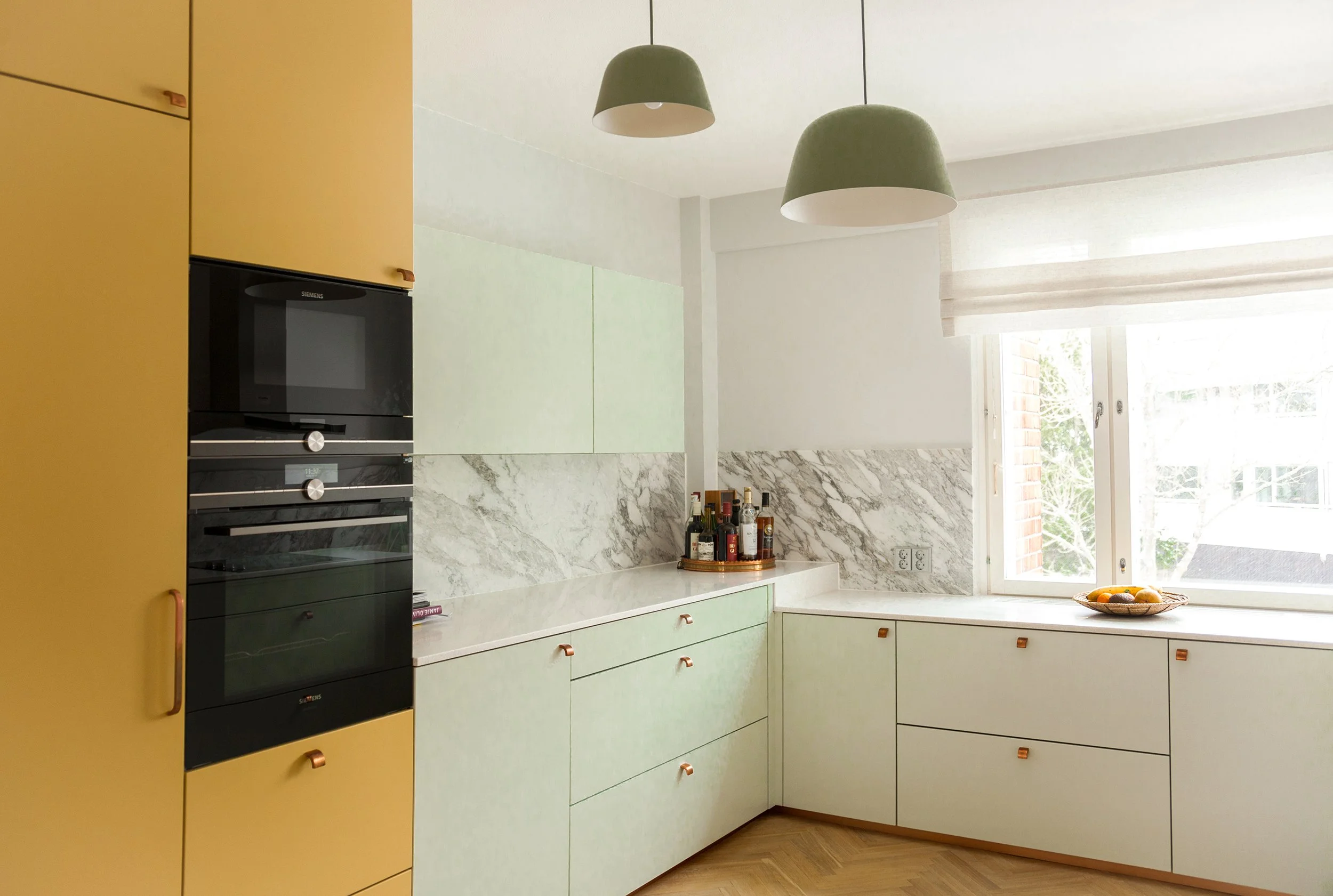 At the heart of the project was a spatial reconfiguration: the kitchen was relocated to a new position, allowing it to merge seamlessly with the living area. This move opened up the apartment, creating a generous, social space where everyday life unfolds naturally.