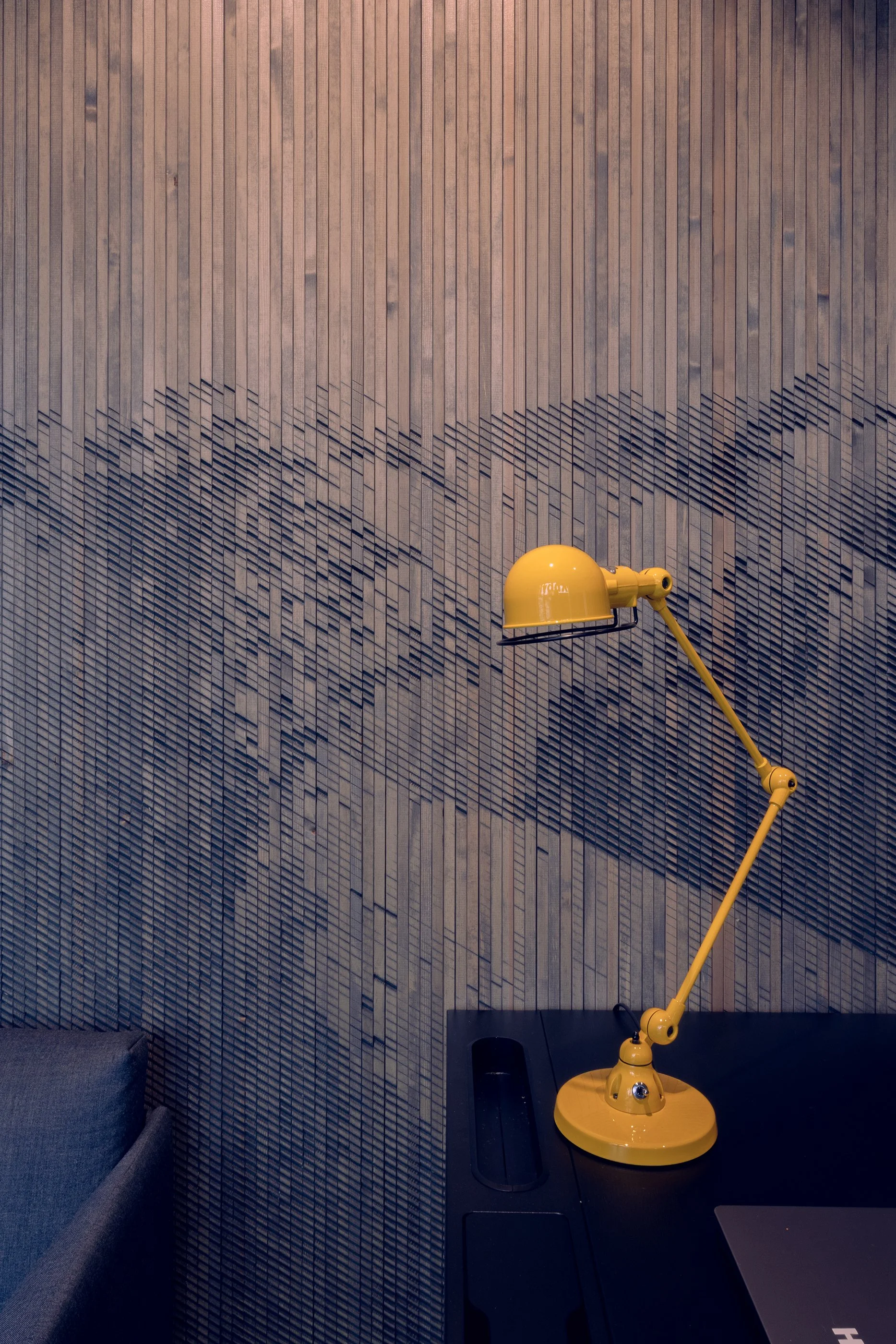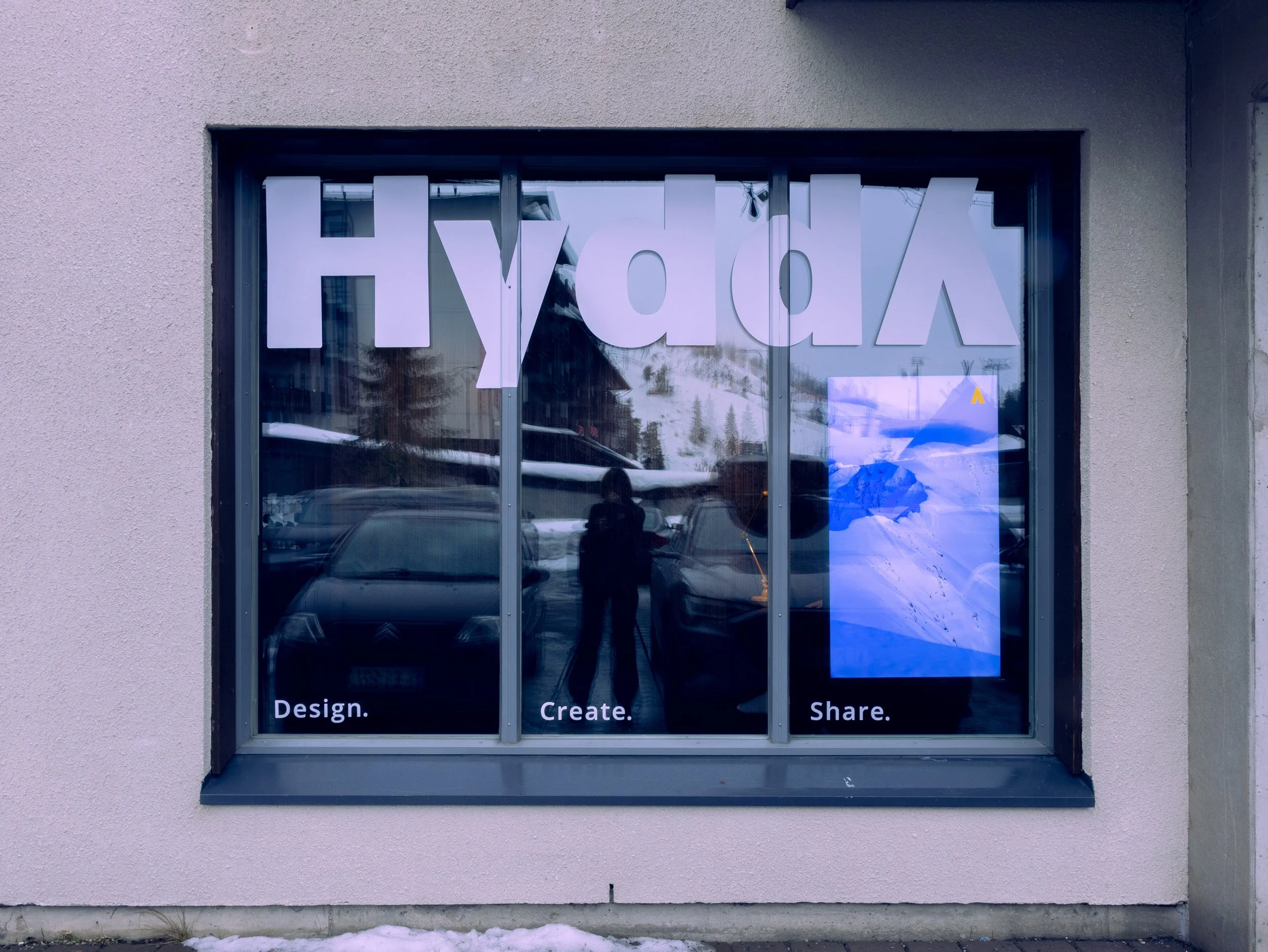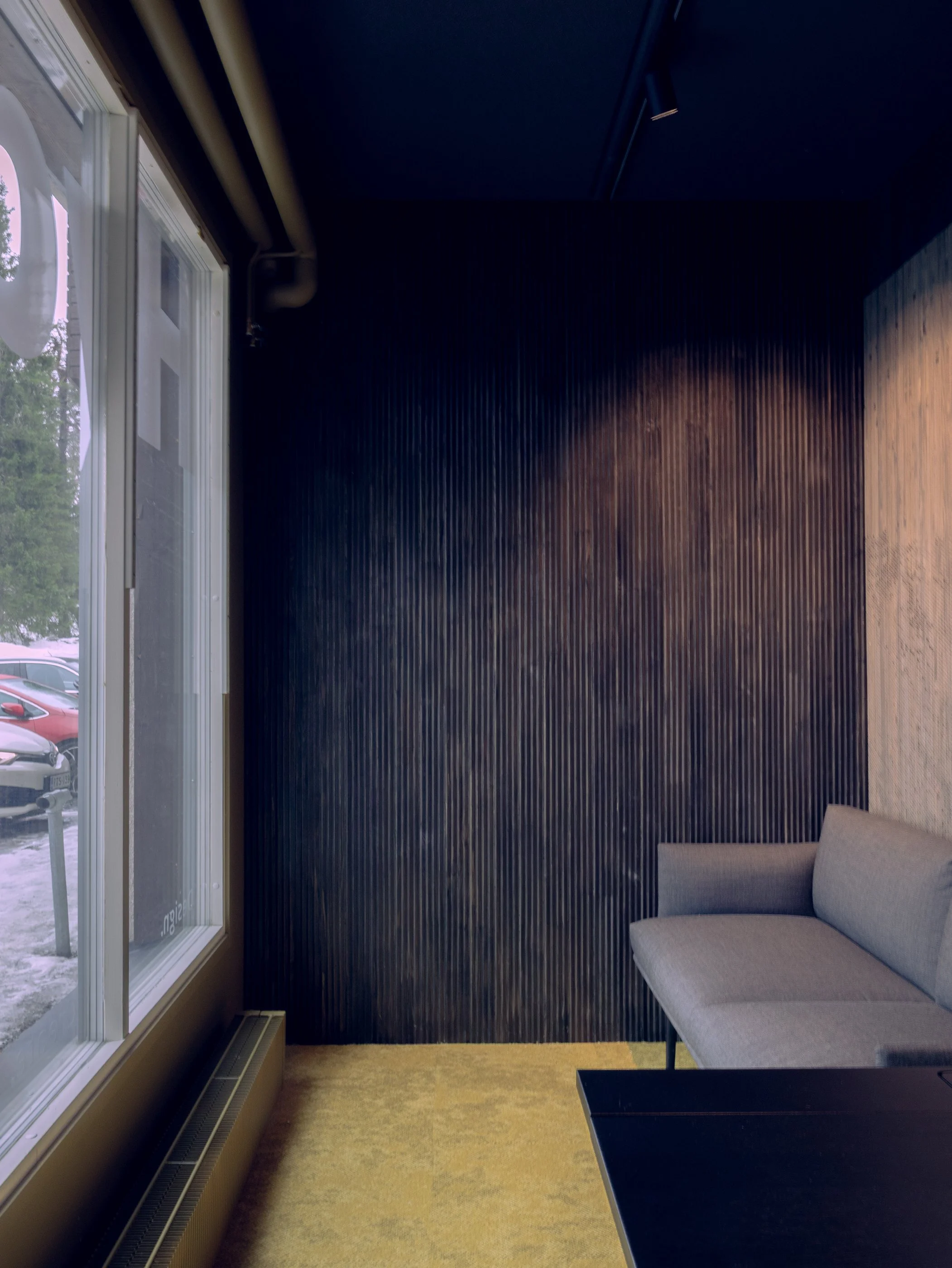 At the heart of the concept is the translation of Hydda’s visual identity into a physical environment. A bespoke CNC-cut wooden panelling, manufactured by Jukola Industries, integrates one of Hydda’s own photographic works directly into the architecture — turning brand content into a spatial feature.