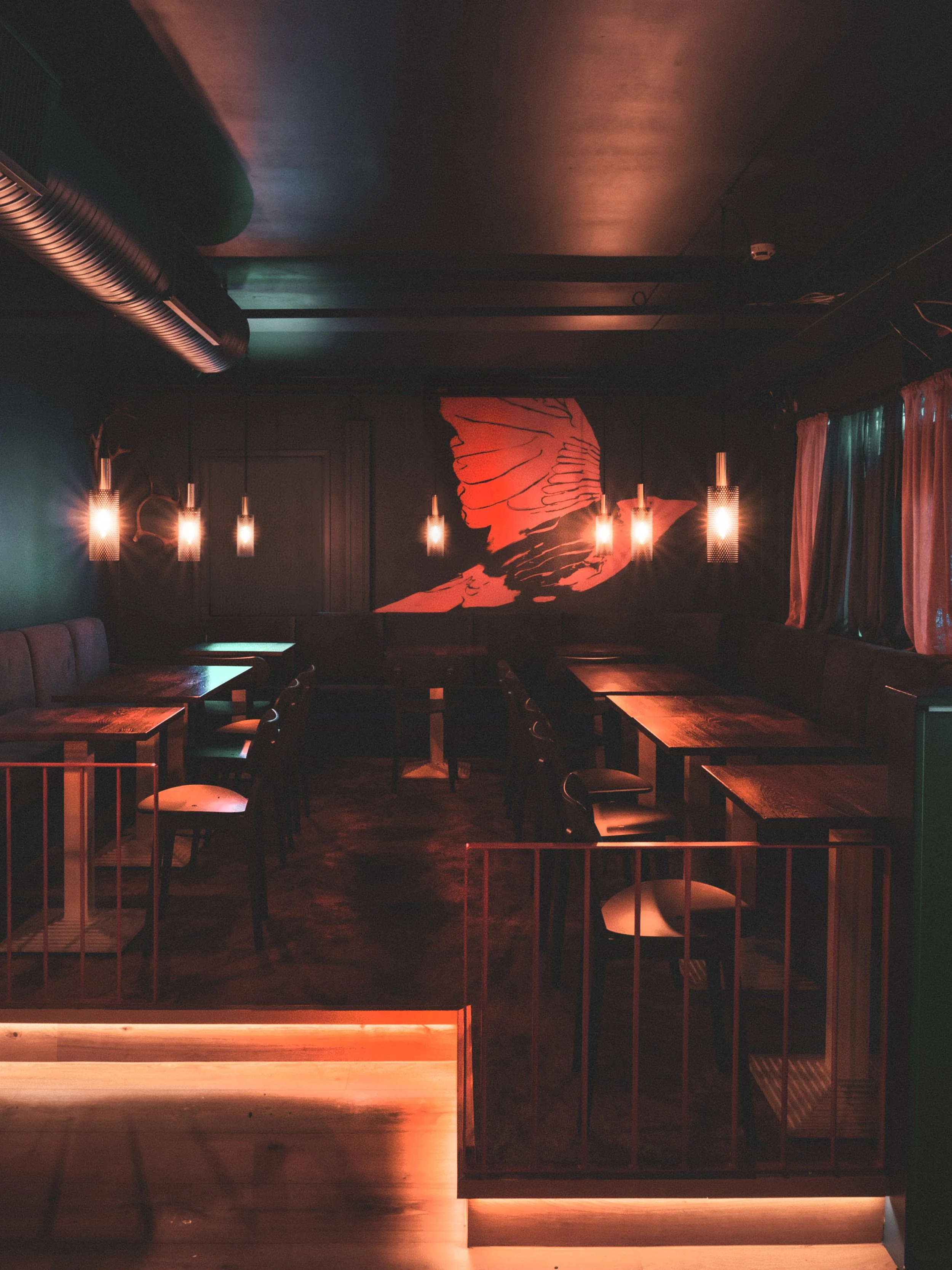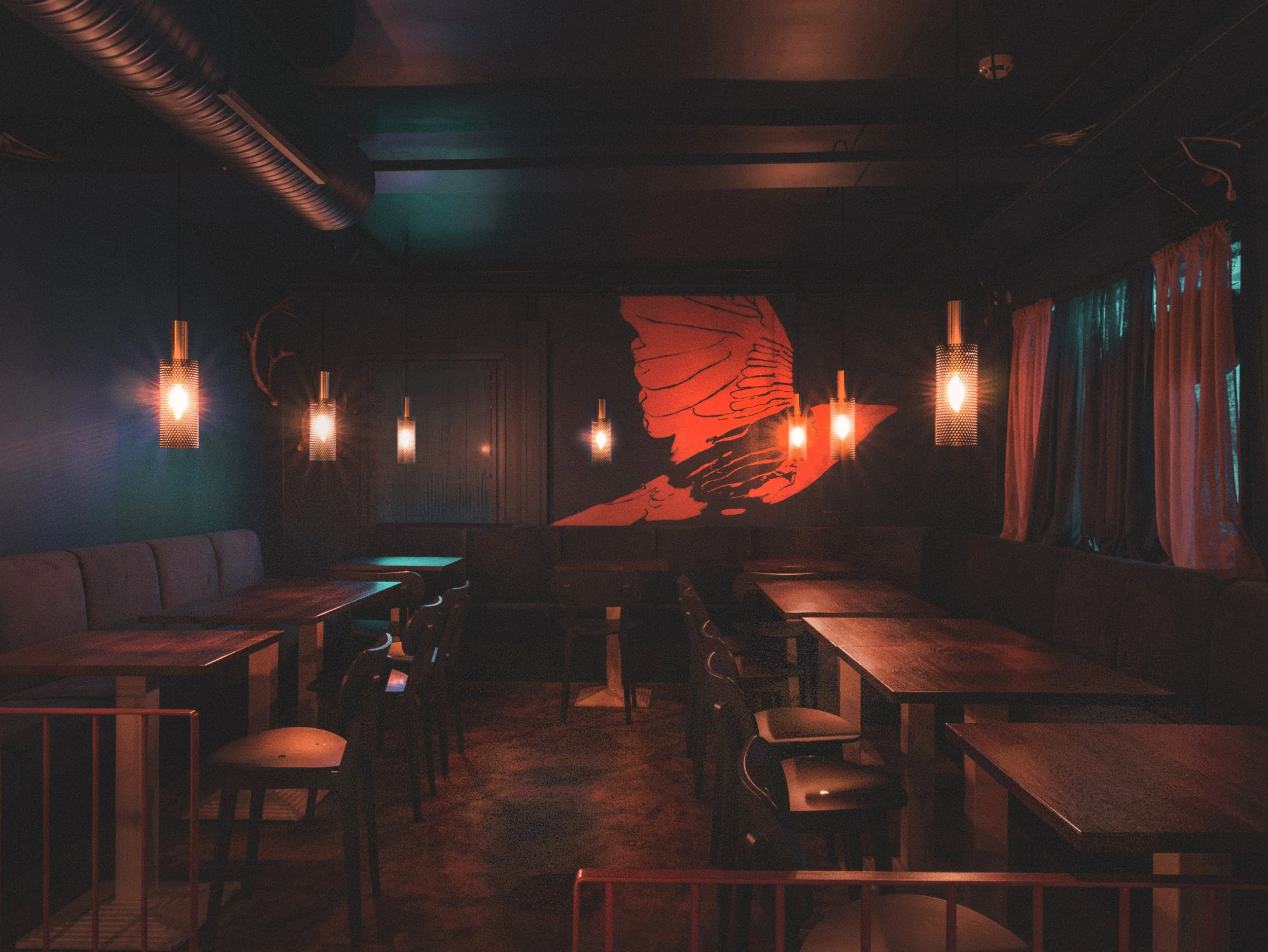 The crow appears both within the interior and across the visual identity, becoming a recognizable symbol that connects the space, signage and branding into one cohesive experience